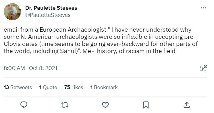 At times, it feels as though pre-Clovis adherents grew impatient with dragging the Clovis Mafia along to their side based on evidence alone, and instead decided to invoke identity politics to seal the deal. The “If you don’t believe me, you’re racist” defense so common today. I think this attitude is still largely confined to the most extreme pre-Clovis adherents, but I see it creeping further into popular discourse with each new discovery. It’s not productive, and pre-Clovis adherents would be well-served to distance themselves from that narrative before it inevitably turns on them. There is nothing inherently more or less pro-Indigenous to either worldview, and we should return to a time when we were simply arguing at conferences and in the pages of boring journals rather than attacking each other’s moral character.